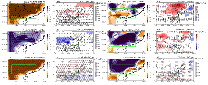 研究发现,人为强迫增加了极端降水事件发生的概率但在月尺度的作用完全相反。具体表现为温室气体导致降水概率增加了150% (Rx5尺度)和61% (月尺度);而气溶胶则抑制了极端降水的发生,并在月尺度表现出更强的抑制作用。这一研究不仅有助于了解2022年珠江流域的极端降雨事件,还能帮助我们更深入地理解不同强迫下降水模式变化背后的机制。